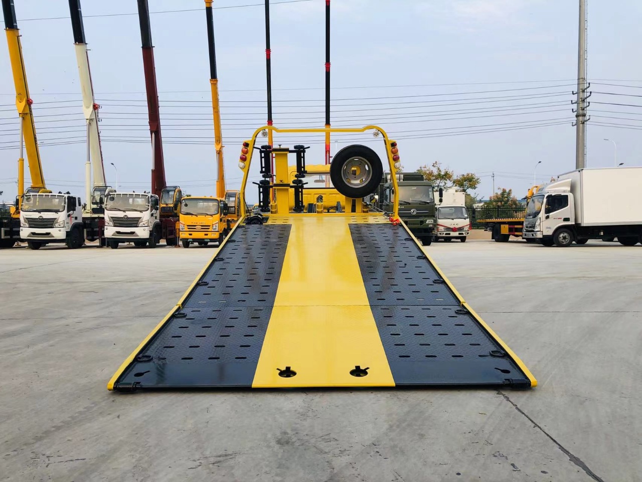 ① 尾部伸縮板,平板長4.2米,尾部120公分的液壓伸縮板),寬2.3米,3噸后托臂,雙側(cè)聯(lián)動操作裝置,1個4噸液壓絞盤,1個工具箱,L型抱胎架1對,擋胎2個,2個**輪小車,4根綁帶.
